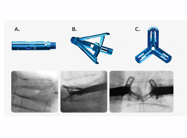 Tripod-Fix device for the treatment of painful osteoporotic vertebral compression fractures. This study is to investigate the clinical outcomes of Tripod-Fix, a novel vertebral augmentation implant, in treating osteoporotic vertebral compression fractures (OVCFs). The clinical results demonstrated that Tripod-Fix effectively